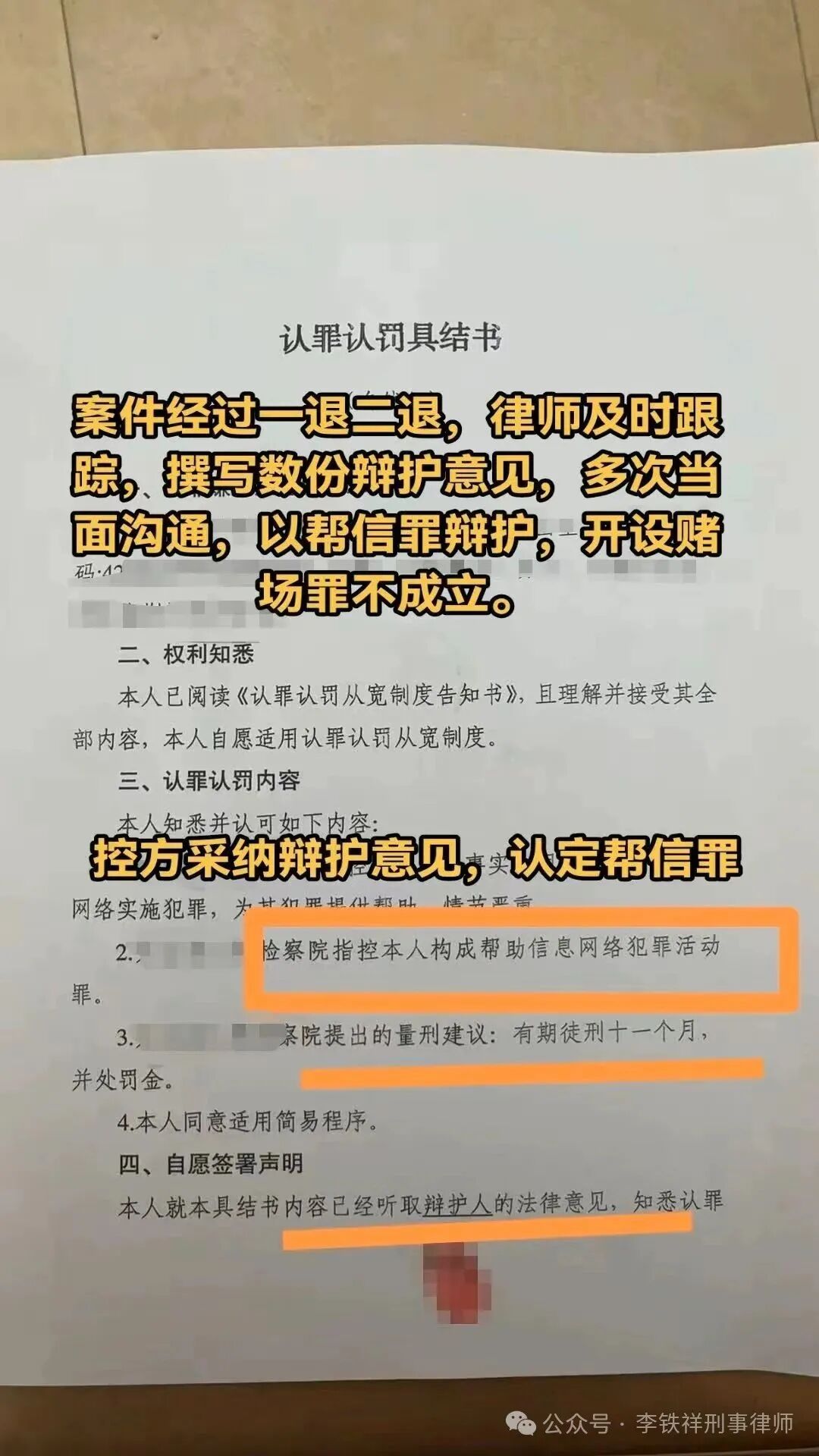 由此,罪名变更,开设赌场罪重罪变更为帮信罪轻罪;量刑建议由可能的五年减刑为十一个月;违法所得认定也减少三分之一。法院开庭,争取调整量刑建议,最终法院判决十个月。