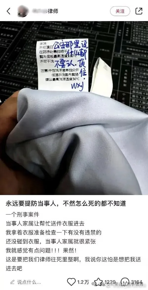 为什么呢?管教要一件一件检查衣服,发现“串供”,会追查,查到家属,家属慑于畏罪压力,会反咬一口,说是律师教的。